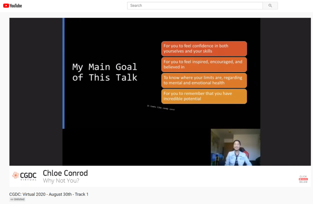 Chloe Conrod delivers an inspirational game development talk at the 2020 Christian Games Developers Conference (CGDC) on August 30, 2020! Click on the link below to view her talk on the CGDC YouTube Channel: