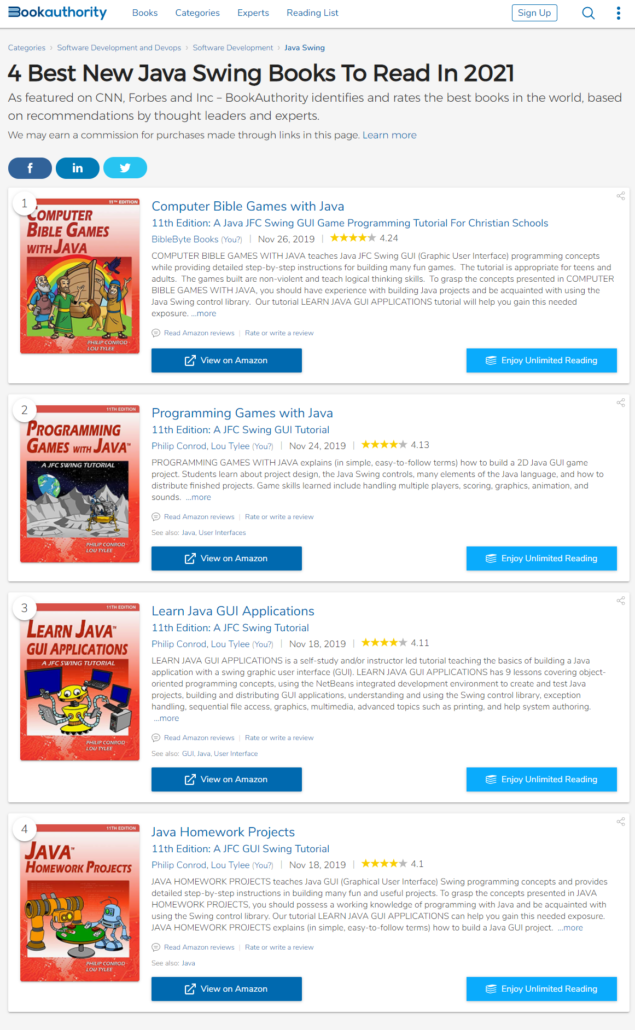 BookAuthority also names Computer Bible Games with Java as One of The Best Java Swing Textbooks of All Time!